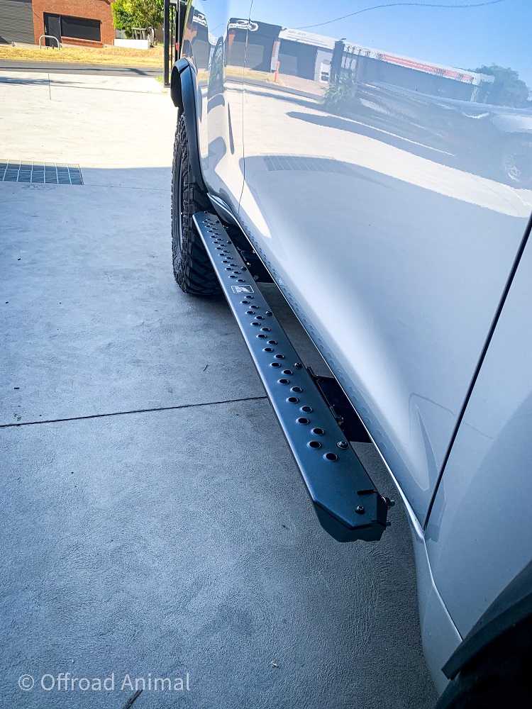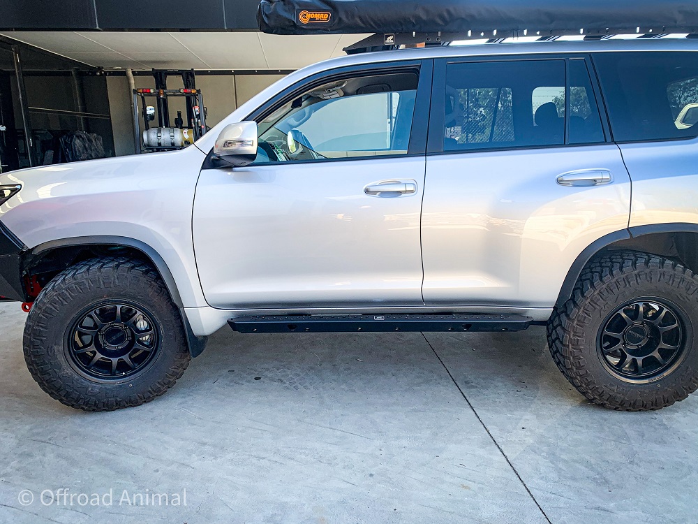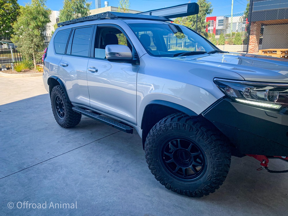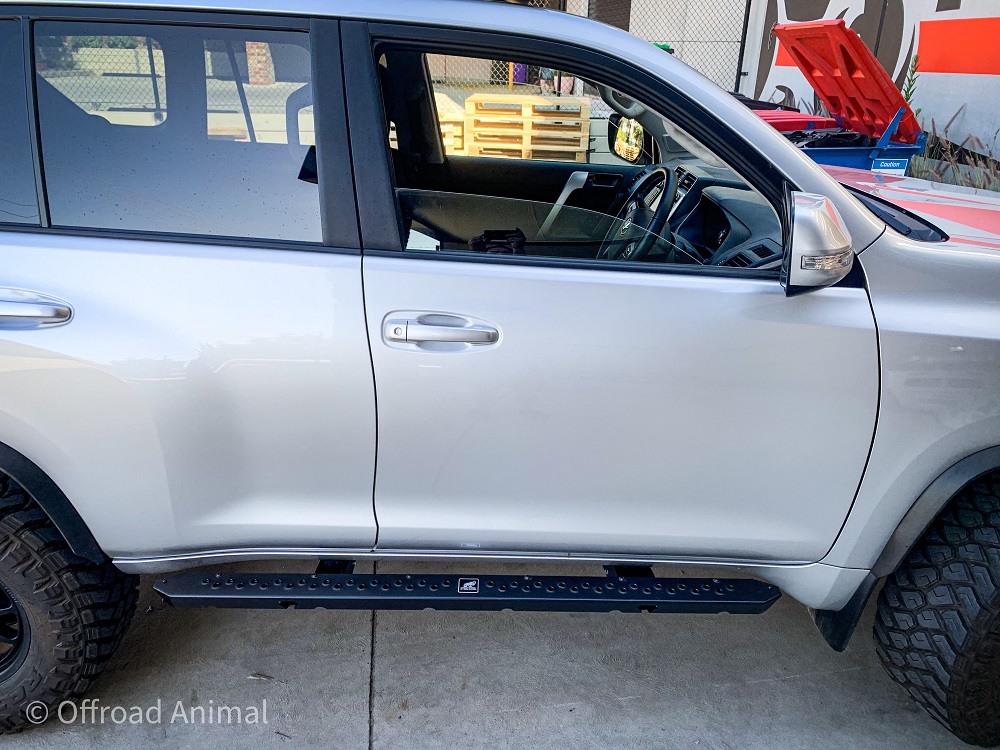 Please note we can only deliver this product to a business address,  if you put a residential address we’ll contact you for a business address.  We can get it dropped at the closest depot if you like.    Do you drive around feeling scared and worried. It’s not you, it’s the lack of sill support under your Prado.  I used to, until I got Offroad Animal Rock sliders for my Toyota. No longer do I stress about side damage.   Okay these rock sliders kick arse.  I mean seriously look at them. No other comes close.  Designed with serious protection in mind as well as stunning good looks, you’ll be the envy of all with these bad boys installed. Don’t let your vulnerable sills cop a hiding.  Ditch those factory piss-weak steps off and install these bad boys for piece of mind protection and great access as a step.    A very innovative design has made these super tough sliders easier to fit than most others.  First install the 2 heavy duty steel brackets on chassis, then install our awesome backbone and tread step.  The backbone is made from ultra tough 6061 T6 Aluminium extrusion that is designed to be much stronger than any steel section other are using. Being similar in weight and much stronger, it also allows for easy fitment of the steel tread plate step.    Benefits Seriously protects side of your Land Cruiser Handy step for getting in and out of your wagon or accessing roof rack Looks way better than any other slider out there Did I mention these bad boys look fully sick bro Easy install Features Side Curtain Air Bag compatible.  Angled up by 30 degrees for awesome off-road clearance. Heavy duty steel brackets mount individually direct to chassis and to backbone Crazy strong backbone, made from Aluminium 6061 T6 Extrusion Tough steel step with extruded tread for nice look and feel, and actually works heaps better than diamond plate for grip Suits all Prado 150 series  2009-on, Does not suit vehicles with KDSS Install time 2 hours Install difficulty: 4/10   Calculated shipping price at checkout is for Metro Brisbane, Sydney, Melbourne, Adelaide, and Hobart.  If you are out of these areas either contact us for freight quote or we will call you prior to shipping for the extra charge
