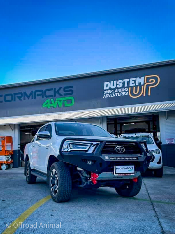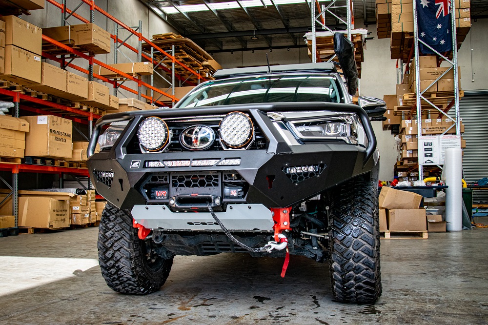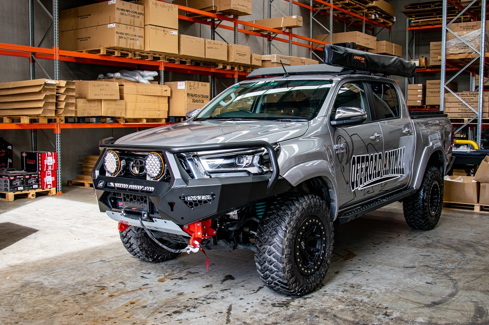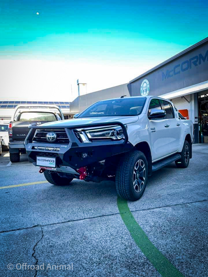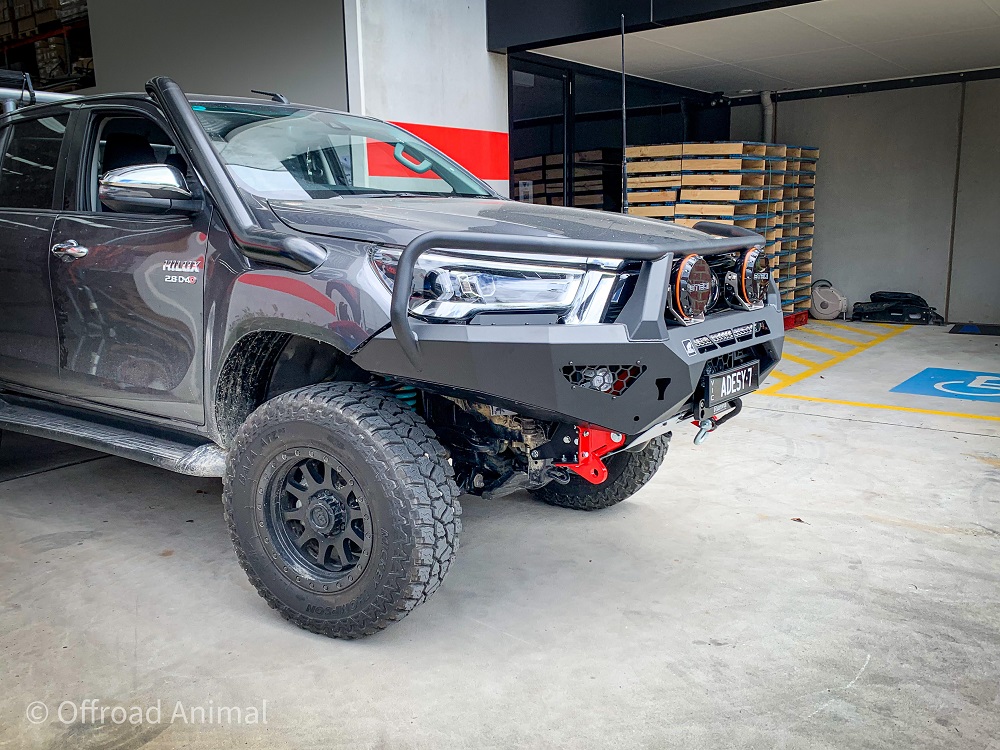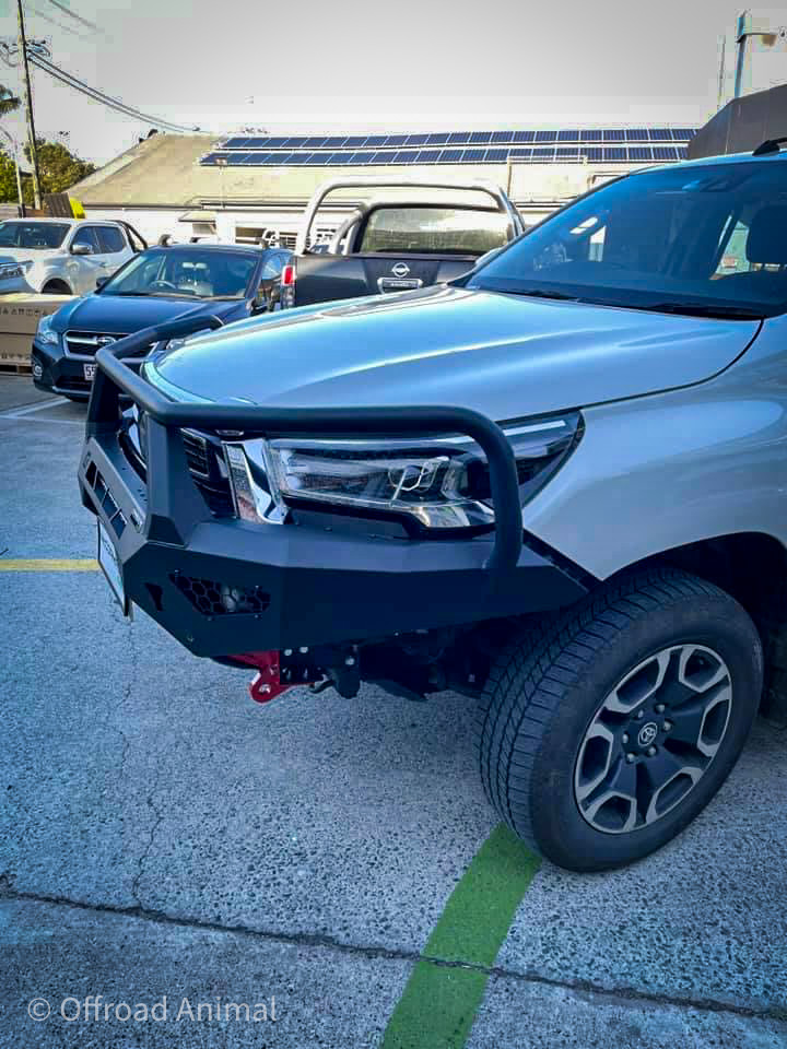 Please note we can only deliver this product to a business address, if you put a residential address we’ll contact you for a business address. We can get it dropped at the closest depot if you like. When a predator bar is not quite enough you might need a Toro bar for that added animal protection. You bought the ever popular Hilux. It looks alright in stock trim but who wants to live with alright when you can have F@#king awesome thanks to Offroad Animal. Hell yes. The Offroad Animal Front bar is the answer. Don’t settle for the same old Vanilla bull bars offered by the rest. Get something that not only looks the best but has awesome features. Show your wild and fun side. Benefits. Looks. Yep this bad boy looks great and will give your Hilux that Super aggressive look Smaller bar means it weighs less so your Hilux can still be fast Better Airflow than the rest to keep your motor cool too. Easy fitment of bar and winch Winch can be fitted after bar is fitted so, yeah, nice Winch mounts feet down, (actually how most winches were designed,) Can have LED light bar fit inside bar for super stealth cool look (up to 22″ LED single row) Cover plate optional if you don’t want to have light bar set into bull bar Features ADR compliant Airbag compatible Suits all Technology including Autonomous emergency braking ( AEB) Bumper replacement, with no cutting of bumper. Welded one piece bar with welded wing supports for super toughness Only sits 150-160mm out from front of grill. Compare that to our standard 3 letter competitors Zinc plated then powder coated Matte black Hi lift jacking points included Suits most low mount winches including Warn Zeon Works with factory fog lights or easily mount 2 Cube lights (per wing) or up to an 8″ LED light bar in each wing. If you want a factory style fog light we suggest these Stedi LED fog lights Number plate flip included for those running a winch Can be colour coded to vehicle 20mm steel tow hooks included on mounts While the bumper takes most single row led light bars (we suggest the Offroad Animal 22″ LED light bar) Stealth top hoop has same arrangement for led light bar, fitting most single row light bars, but we suggest the Offroad Animal 22″ LED light bar- * Those with adaptive cruise in the Toyota badge can not run our stealth hoop as it blocks the Radar. Included in box 1 x Front bar weldment 1 x LH chassis impact bracket 1 x RH chassis impact bracket 1 x mesh fairlead mount 1 x Mesh infill LH 1 x Mesh infill RH 1 x Light cover Mesh LH 1 x Light cover Mesh RH 1 x fog lamp bracket LH 1 x fog lamp bracket RH 1 x centre bash plate 1 x under wing panel LH 1 x under wing panel RH 2 x Antenna brackets 1 x Chassis brace LH 1 x Chassis brace RH 1 x winch control box bracket 1 x number plate flip A butt load of nuts and bolts to make it all sit nice and pretty Suits all 4wd Hilux’s 2021 ON excluding Rogue and Rugged X Install time: 3 hours Install difficulty: 5/10 Please note we can only deliver to business addresses, if you put a residential address we’ll contact you for a business address. We can get it dropped at the closest depots if you like. Calculated shipping price at checkout is for Metro Brisbane, Sydney, Melbourne, Adelaide, Hobart. If you are out of these areas either contact us for freight quote or we will call you prior to shipping for the extra charge Colour coded bars are not colour matched. If you want colour matched you need to send us a vehicle panel to match. Colour code is close but not exact match. Please put your VIN so we can get Colour code. Colour coding generally adds 1-2 weeks on to lead time.